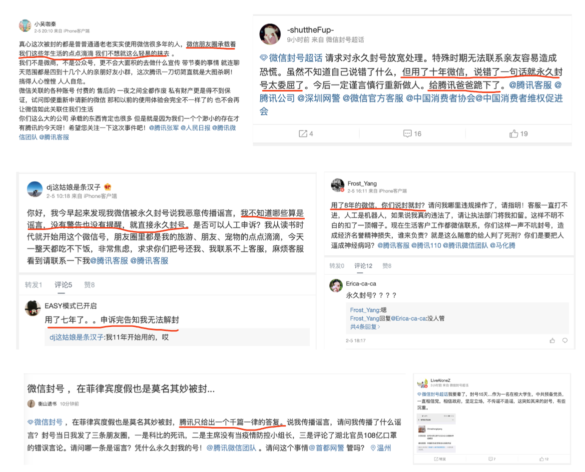 从2020年2月1日起,大量微信用户账号被短期或永久地封禁,相关讨论话题迅速成为微博超话。被封号者大多不明白自己做错了什么,因而陷入错愕。申诉,呼告,自证清白,恳求微信官方开恩。是否申诉成功,谁都没有把握。但损失已经造成,且代价巨大。只有到了此刻,人们才猛然发觉,自己对微信账号的掌控是如此脆弱:原来我们从来没有自己账号的所有权。