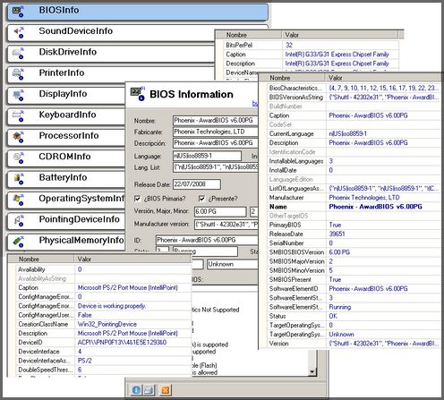 - TBIOSInfo: La clase Win32_BIOS representa los atributos del servicio de entrada y salida básico del sistema (BIOS, Basic Input/Output Service) instalado en el equipo.MSDN link: https://docs.microsoft.com/en-us/windows/win32/cimwin32prov/win32-bios