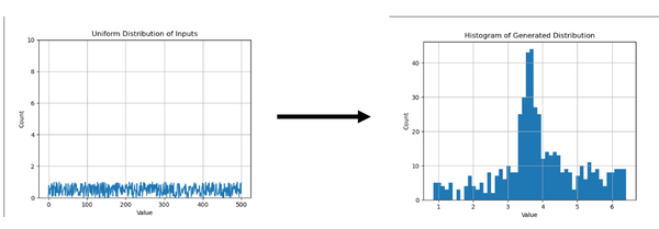 The goal of this GANs is to generate a Gaussian normal distribution from a uniform distribution; The task goal can be visualize like this: