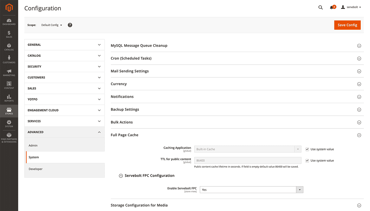The built-in Magento caches on the other hand, can still be managed from the System > Stores > Cache Management page. Emptying this page cache will clear the Magento-internal page cache, but not necessarily expire the Servebolt cache right away. If installed with the default settings, expect the HTML to be refreshed within 10 minutes.