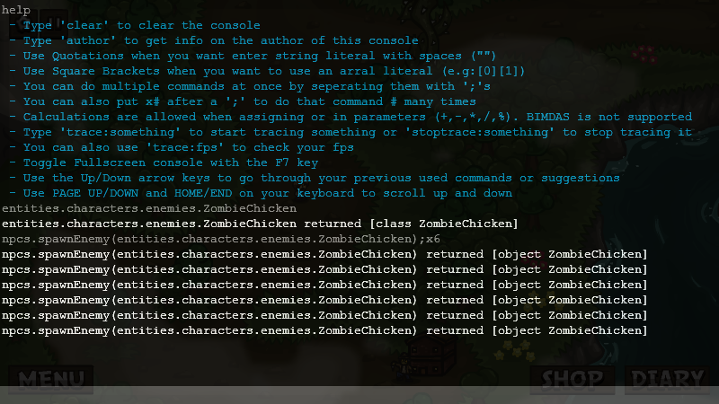 - Multiplying Commands: Put an x and a number after a command to repeat it that many times (eg: spawnEnemy();x5)