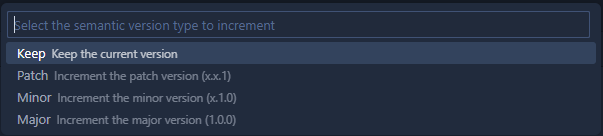 Ctrl+Shift+V(Windows/Linux) orCmd+Shift+V(macOS). - The extension will prompt you to select the type of version increment (patch, minor, major).