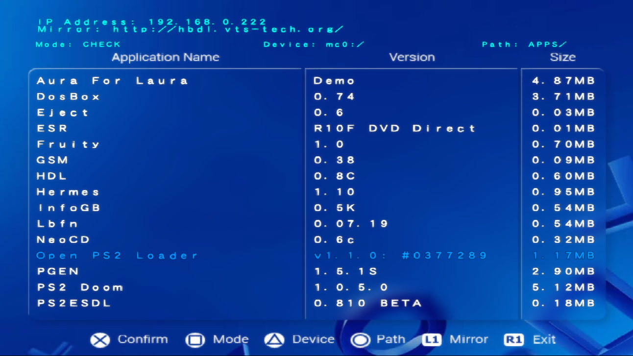 Changelog: v0.31 2020-10-17 11:59PM file_crc32() updates Code cleanup v0.30 2020-10-13 12:49AM Now POSIX compliant No longer using fio/fileXio calls Updated wLaunchELF to v4.43A Commit 970ca992 Removed some verbosity from Download() v0.29 2020-10-09 11:02PM Added LBFN v0.07.19 WIP by Nika Mod by HWC Updated ESR to R10F DVD Direct Updated OPL to 1562-Beta CI-compile #85: Commit 41f7cf0 Updated RetroArch to v1.9.0 Now supports 27 HomeBrews v0.28 2020-06-09 1:26AM Now downloads HomeBrew List upon start. Added DOSBox, PS2DOOM Removed some verbosity from Download() Added some verbosity to DownloadList() Now supports 26 HomeBrews v0.27 2020-06-08 5:10AM No longer using loader.elf Using LoadElf() from MPLUS-LOADER3 Now displays remote filesize Now displays remote version Reorganized menu to accommodate new items Menu now dynamically aligns itself Added 'Aura for Laura' Demo Added ZoneLoader Updated RetroArch, OPL, SNES9X, PSMS Now supports 24 Homebrews v0.26 2020-06-07 10:15AM Renamed ESDL to PS2ESDL Now supports downloading multiple files per homebrew! Added NEOCD Added PGEN Added PSMS Added PVCS Added SNES9X Fixed bug reading CRC's when entire filename was present in two homebrews. Now supports 22 Homebrews v0.25 2020-06-06 1:05AM Now supports USB! 2 more Homebrews added (VTSPS2-EJECT & VTSPS2-TESTMODE) Now supports 17 total Homebrews No longer in ALPHA, First BETA release. v0.24 2020-06-05 6:29AM Now displays Remote CRC32 Local CRC32 defaults to 'unchecked' Checking for files that don't exist tentatively working. 00000000 is File Not Exist v0.23 06-03-2020 8:29PM Added INFOGB, PS2SX Now Supports 15 Total Homebrews Now using 8.3 Filename standard. Current CRC32 List now distributed with binary releases. v0.22 06-02-2020 9:45PM Added support for more homebrew Added HTTP Mirror support. Added Cuban mirror. Thanks HWC! Added missing 'Push Start to Exit' to menu Added ESDL.ELF, 2048.ELF, FCEU.ELF, PICO.ELF Launching Homebrew now partially functions. Launches WLE/OPL in real hardware testing .. but not Pico/FCEU v0.21 06-02-2020 4:45PM New Menu Now displays IP on main screen Supports many more homebrews. Fully functional in PCSX2 Tentatively fully working on Real PS2 -Checking -Downloading+Overwrite -Downloading+Creating Folder All work on my SCPH-70001 with this build. Code cleanup. Removed delays/debug output. v0.2 05-30-2020 10:15PM First functional release. Supports OPL, WLE, HDL, ESR CRC32 is displayed but not compared currently. Tested on real hardware (SCPH-70001). Overwrites existing files correctly. Only writing to MC0 for now. v0.1 05-26-2020 01:44AM Initial Fork