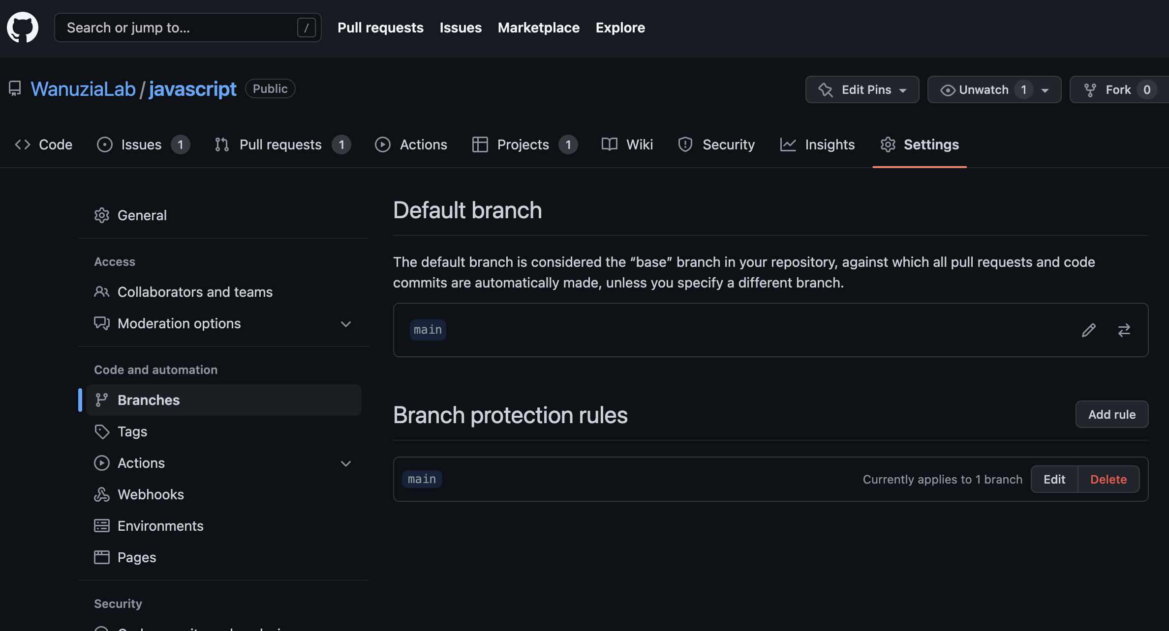 Seria ir em: https://github.com/WanuziaLab/javascript/settings/branches