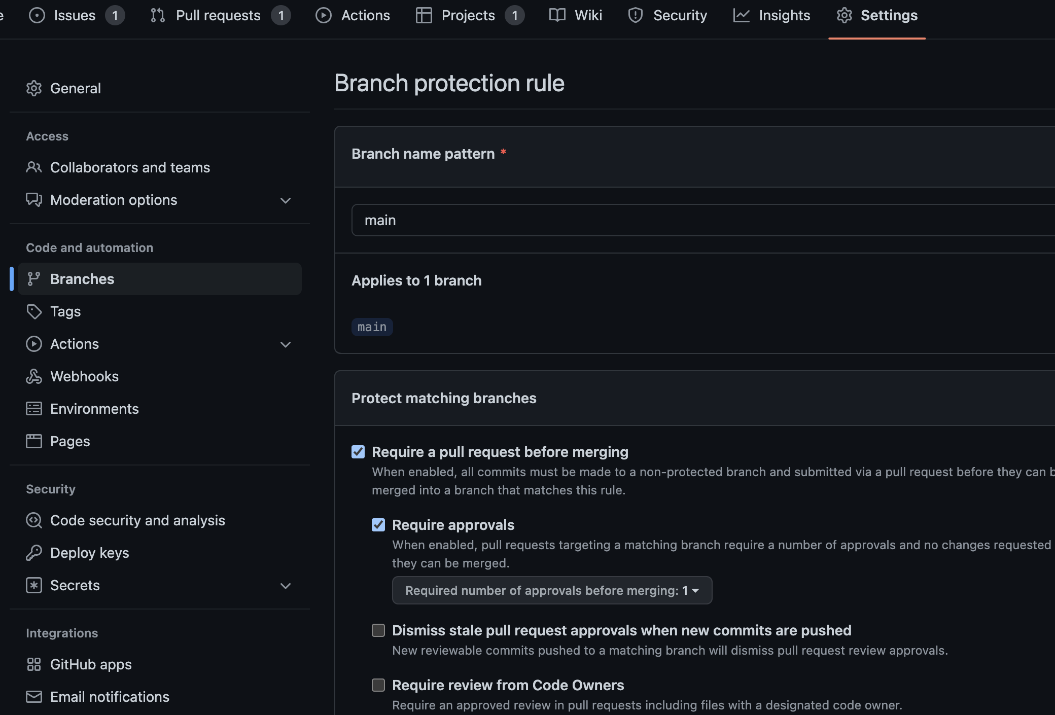Depois Require a pull request... E escolher o numero minimo. Escolher se tem que ter ao menos 1 aprovacao do codeowners e demais config..