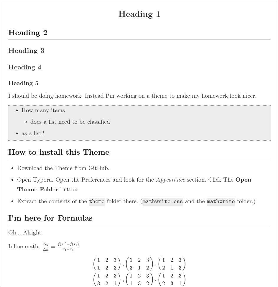 Mathwrite This is a Typora theme based on qqdaiy55's Engwrite theme. Page breaks (when exporting to PDF) can be achieved with a horizontal line: --- or <hr>. Included fonts (Computer Modern) are under the SIL Open Font License. Preview