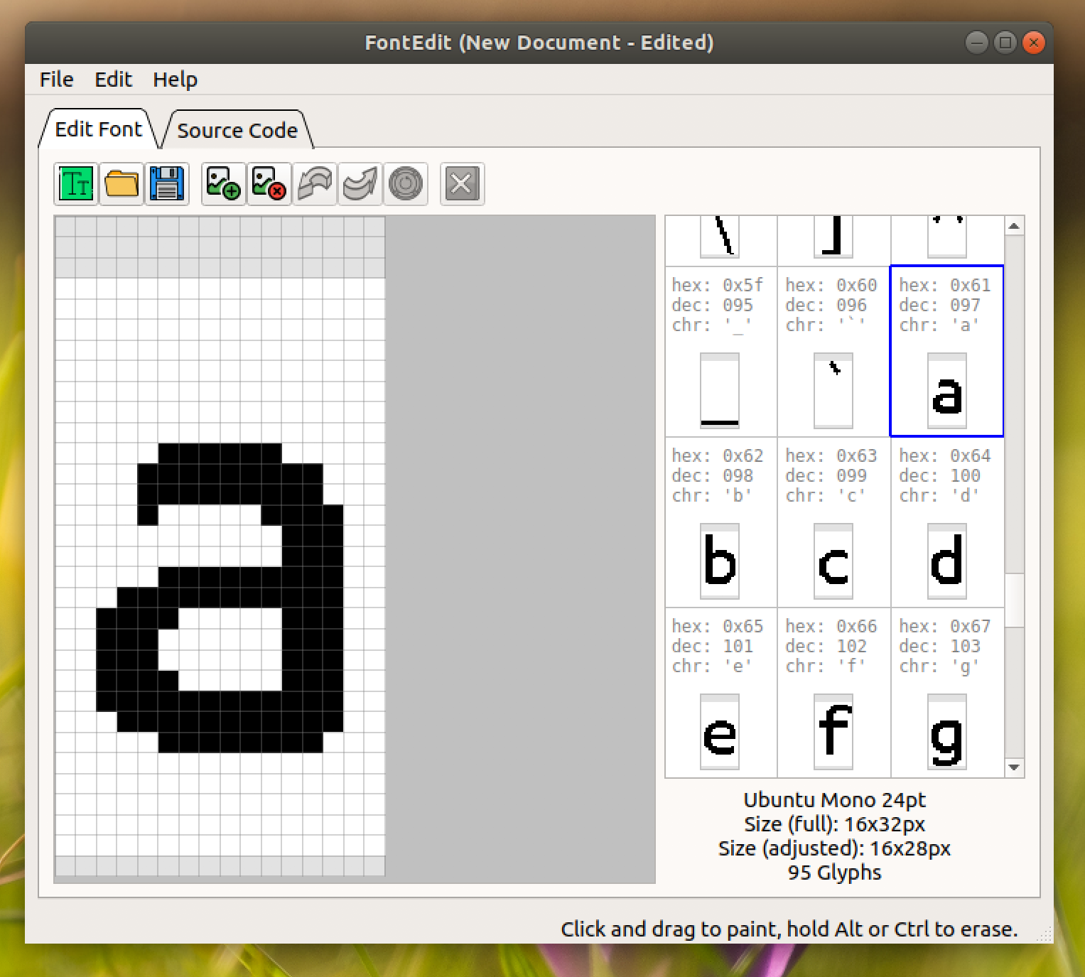 You can edit font glyphs with a minimal editor that's controlled with a mouse and keyboard. Click and drag the mouse to set pixels (making them black), hold Alt or Ctrl (⌘) to erase. Use touchpad scroll (mouse wheel) with Ctrl (⌘) to zoom the editor canvas.