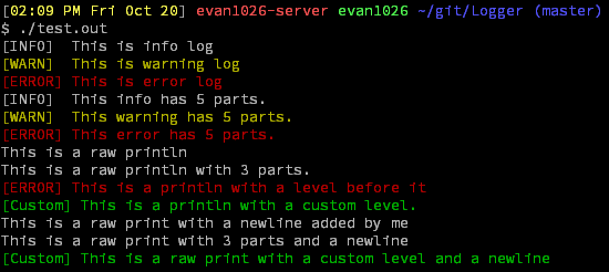 The first argument is the prefix string. This is output before each line of that level. The second argument is the color string. It gets output before every line if colors are enabled. Colors are enabled on linux and MacOS and they can be explicitly enabled or disabled per-stream. You can even add your custom level object to the Logger::Levels namespace to keep everything together.