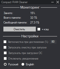 Compact RAM Cleaner 🇷🇺 Описание Небольшая программа для очистки ОЗУ Есть тихий ключ silent для запуска сразу в трее 🇺🇸 Description Small program for cleaning RAM There is a silent key - silent to start immediately in the tray