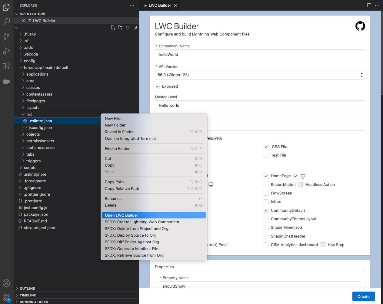 - Right click on the "lwc" folder of your SFDX Project and click "Open LWC Builder"