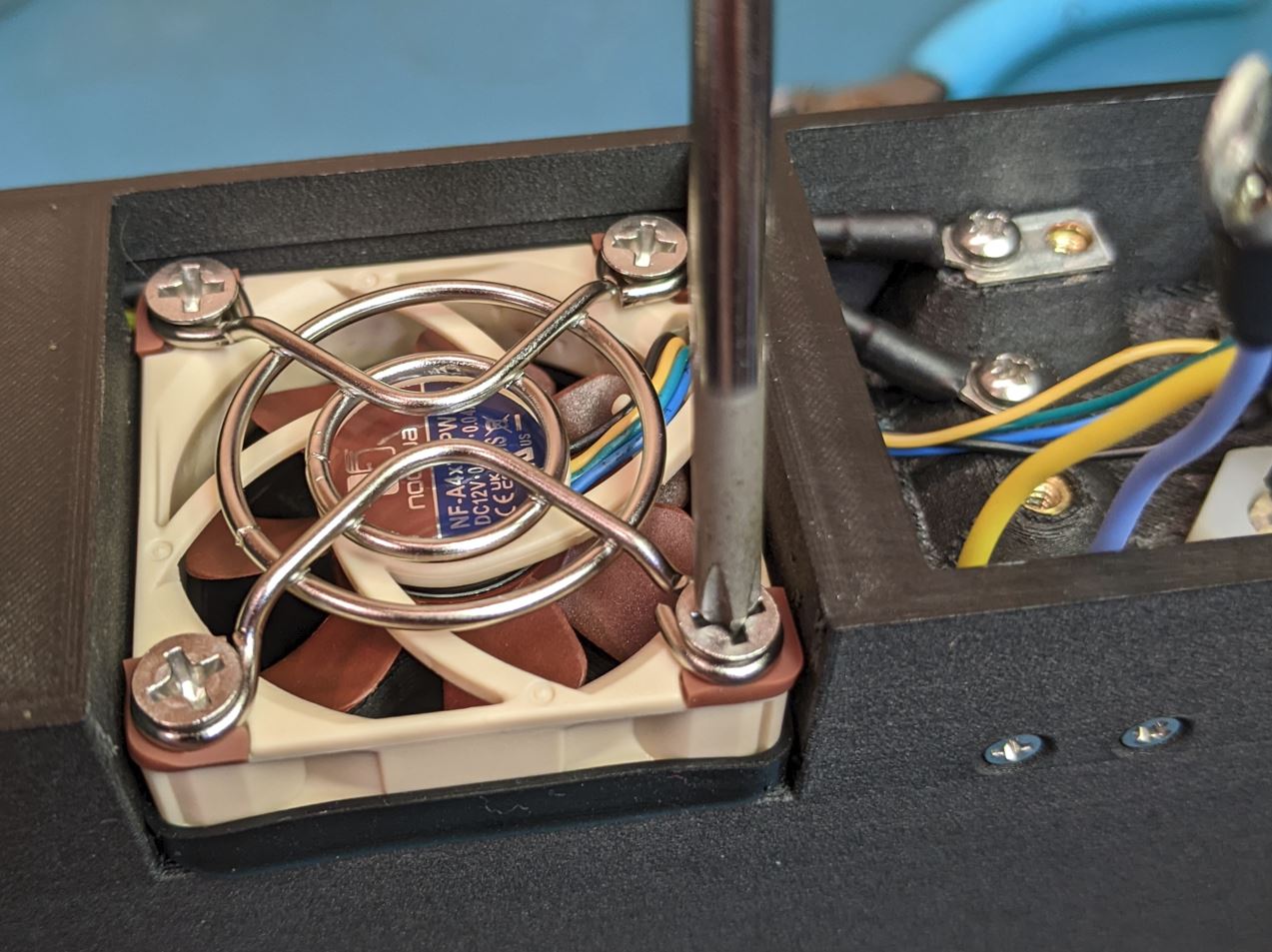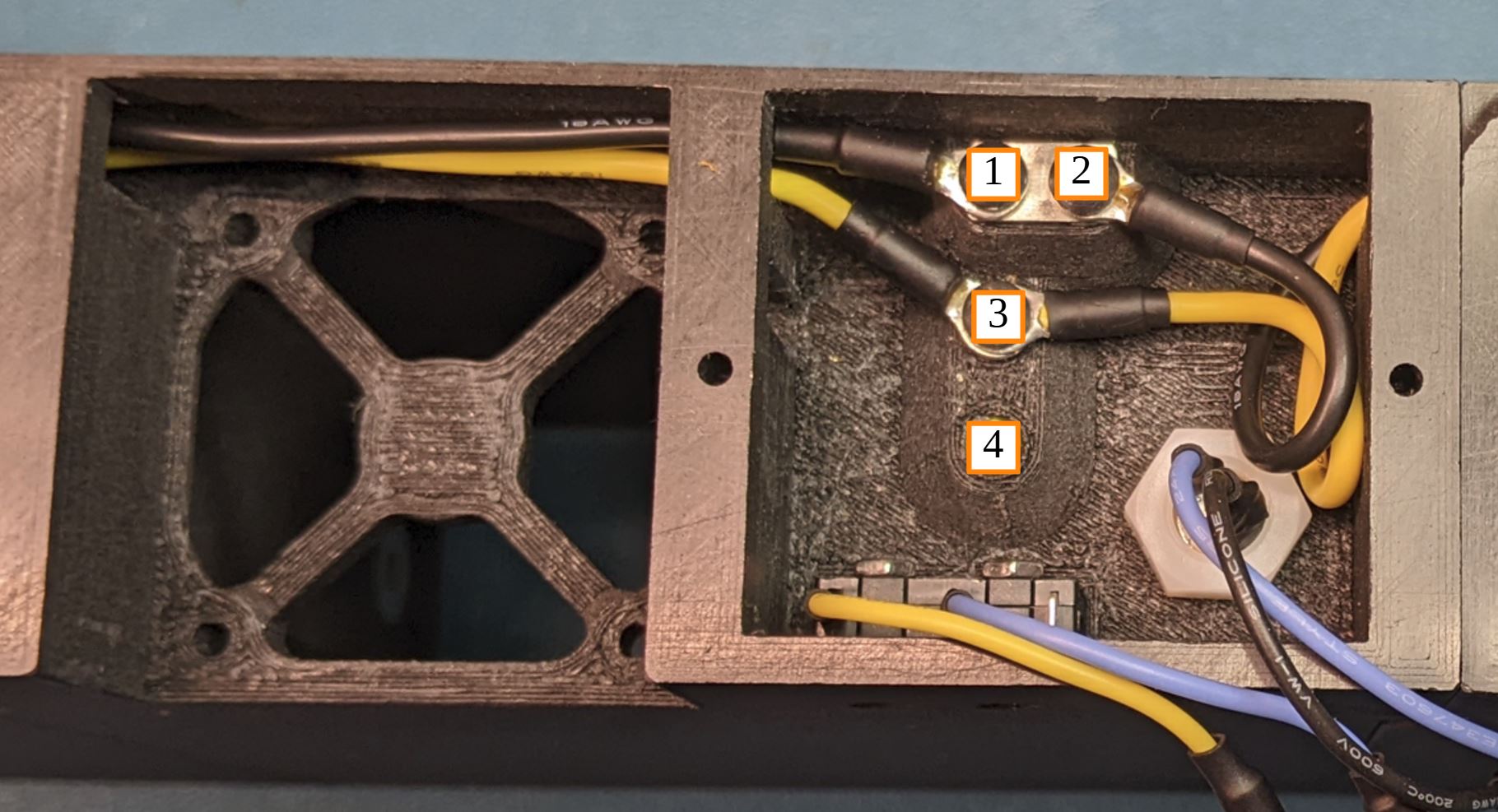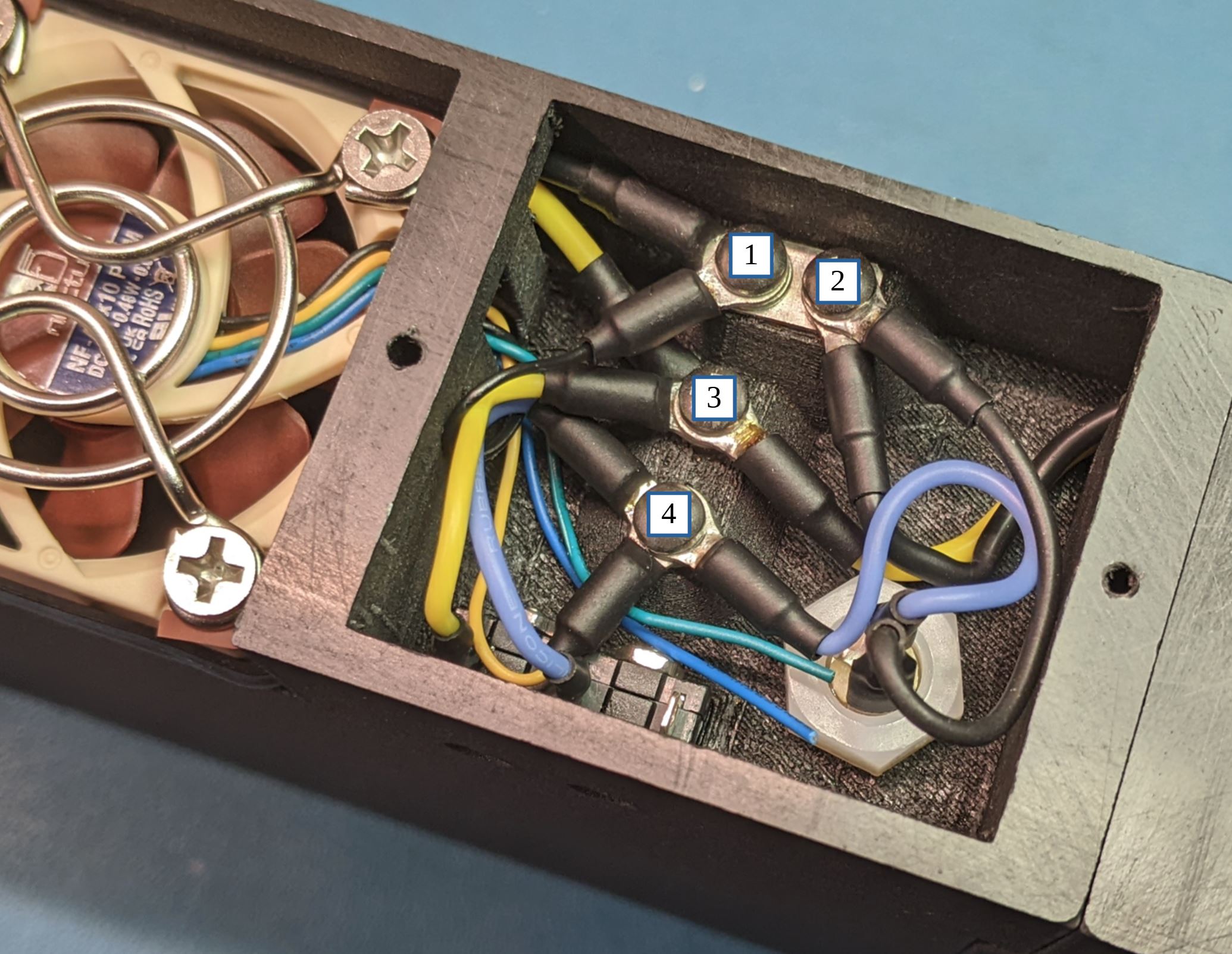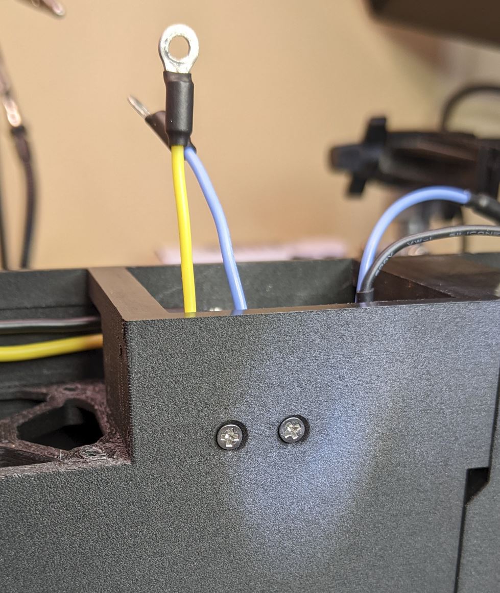 Attach the black ground wire from the left to the top left most screw. Place a jumper plate between the terminal and the threaded insert. Attach the yellow wire from the left to the screw terminal in the middle. Make sure that the two transfer wires from the left sit flat along the top of the case where they go over the fan cutout. Not required at this point, but you can also attach the transfer wires to the next module (to the right). You will want to make sure that the wires sit flat above the fan and any extra wire length is contained inside the wirebox near the connector.