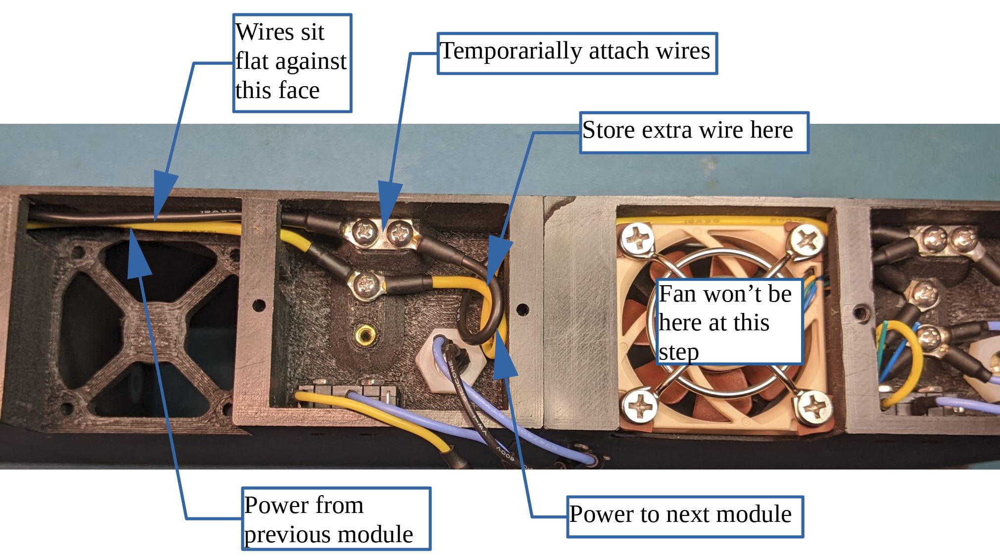 Arrange and screw down the transfer wires. Looking at the back of the case, wires from the left are from the previous module and wires to the right are going to the next module.