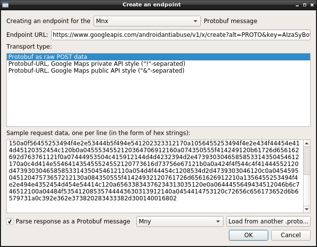 You may also give some sample raw Protobuf data, that was sent to this endpoint, captured through mitmproxy or Wireshark, and that you'll paste in a hex-encoded form.