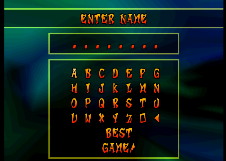 So. Stuff happened in Crash Bash lately, and as the first real Memory Manipulation to be discovered in a game I have some remote interest in (It's a PS1 game of the Sprash sort...), I needed to jump in an try to uncover its secrets. Quickly, after playing around with it, I found the memory adress that contains which letter/action of the "ENTER NAME" screen is selected... Those actions are in a simple array, with A being 0 and CANCEL being 29, and it happens that they never fool-proofed pressing Down-left on V, which takes you to ID 34. Great. Now from there you can do 5 things: