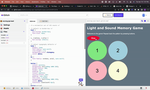If you used any outside resources to help complete your submission (websites, books, people, etc) list them here. [I used a javascript tutorial youtube video by Programming with Mosh to help me learn the syntax and power of javascript. I also used StackOverflow to help me develop the function which generates a random pattern for the game every time the game is started and to style the buttons.]