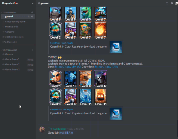 This lambda posts data about your war games in you Clash Royale clan to a Discord Web Hook. Integrates with RoyaleApi.comi, Cloudinary, is.gd and Discord. Set the lambda to for instance run every 15 minutes.