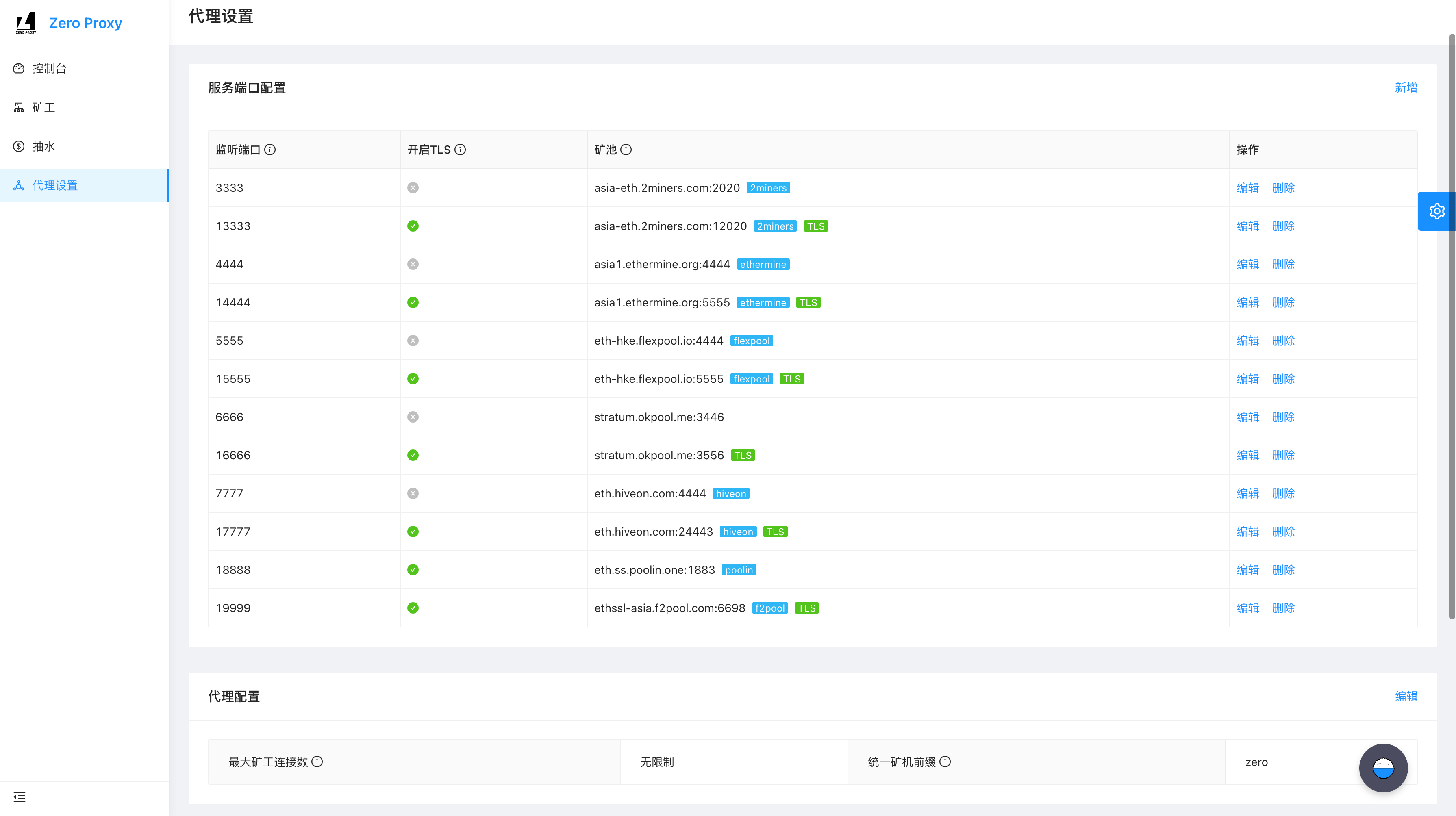 pm2 start zero-proxy_linux --name zero-proxyconfig.js为矿池代理的配置文件,可以通过在控制台中设置,亦可直接在文件中配置。